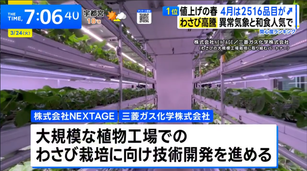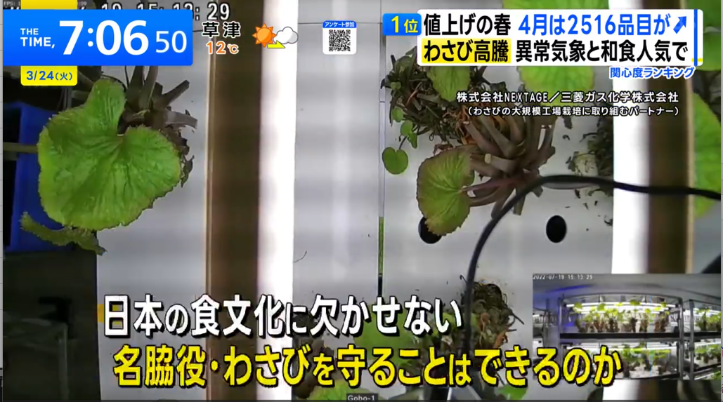 朝の情報番組『THE TIME』(TBS)にて、わさび高騰のニュースが「関心度ランキング1位」で扱われましたが、 その中で弊社の取組みが打ち手の一つとして紹介されました。世界的な日本食人気と環境変動等による大幅な生産減少。弊社はこの課題に対し、今後も真摯に向き合って参ります。
