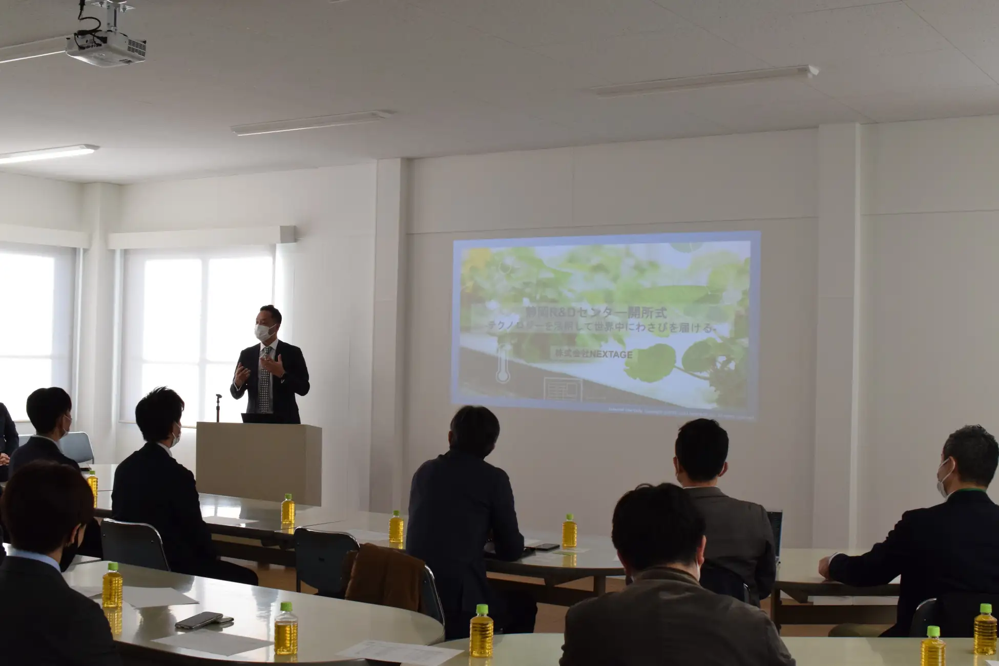 開所式は、2023年2月14日に開催致しました。当日は、株式会社イシダテック様の食堂スペースをお借りし、弊社より静岡R&Dセンターの開設の意図や事業方針のご説明を行ったのち、実際に施設に移動し、内部を見学いただきました。